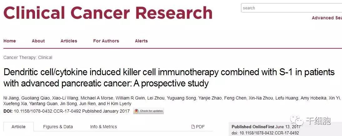 首都醫(yī)科大學(xué)任軍教授研究團(tuán)隊(duì)在國際期刊Clinical Cancer Research (IF=9.619)上發(fā)表論文,題目為“Dendritic cell/cytokine induced killer cell immunotherapy combined with S-1 in patients with advanced pancreatic cancer: A prospective study”。