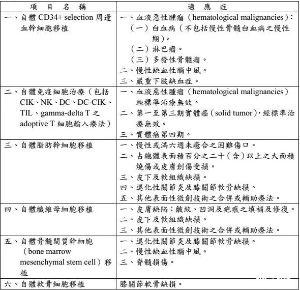 6項(xiàng)細(xì)胞治療項(xiàng)目分別為,自體周邊血干細(xì)胞移植、自體免疫細(xì)胞治療(包括CIK、NK、DC、DC-CIK、TIL、gamma-delta T之adaptive T細(xì)胞輸入療法)、自體脂肪干細(xì)胞移植、自體纖維母細(xì)胞移植、自體間充質(zhì)干細(xì)胞移植、自體軟骨細(xì)胞移植術(shù)。
