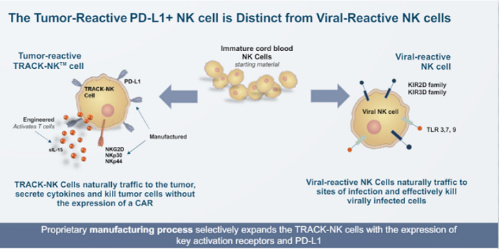 CYTO-102是一種由PD-L1陽性腫瘤反應性NK細胞(TRACK-NK?) 組成的通用型細胞療法,通過對NK細胞進行基因修飾以分泌高水平的可溶性IL-15。IL-15是一種免疫信號分子,在患者自身免疫系統(tǒng)的最佳抗腫瘤反應中十分重要。在CYTO-102的制造過程中,IL-12、IL-18及其他信號分子可以誘導工程化NK細胞表達PD-L1,PD-L1陽性TRACK-NK細胞可以自然定向到腫瘤微環(huán)境殺死癌細胞,并調(diào)節(jié)患者自身免疫系統(tǒng)的適應性或T細胞反應。