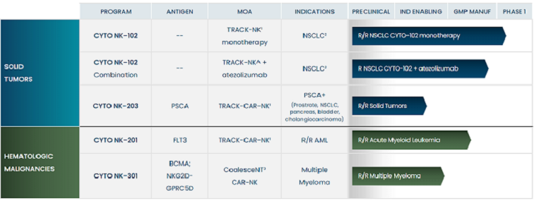 此次臨床試驗旨在評估CYTO-102單藥或與atezolizumab(阿特珠單抗)聯(lián)用治療復發(fā)/難治性NSCLC患者的安全性和耐受性,以及關鍵的生物學終點包括NK細胞持久性和轉運,腫瘤微環(huán)境的變化以及被CYTO-102募集的內(nèi)源性T細胞和NK細胞。