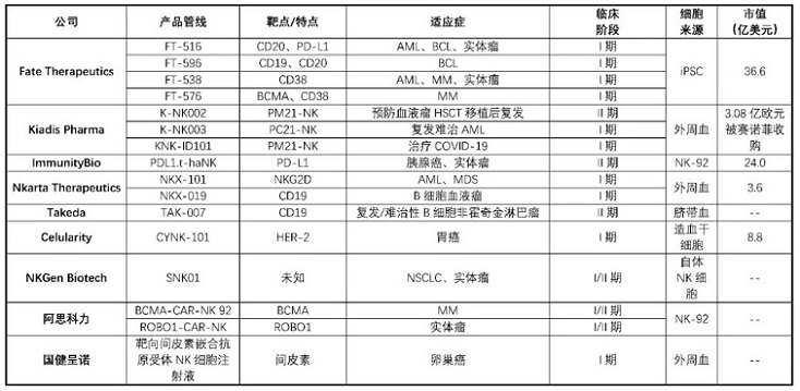 根據(jù)ClinicalTrials.gov網(wǎng)站公示信息,目前已有許多CAR-NK產(chǎn)品的臨床試驗正在開展中,大部分處于I/II期臨床試驗階段。靶點多數(shù)是常見的惡性血液癌癥靶點(如CD19、CD20、BCMA、CD33)等。還有一些CAR-NK產(chǎn)品靶向的是實體腫瘤相關(guān)抗原(如間皮素、ROBO1、NKG2D)等。CAR-NK細(xì)胞在腫瘤中的作用正在被廣泛研究。目前已經(jīng)進(jìn)入臨床研究階段的代表企業(yè)和CAR-NK管線梳理[表1]。