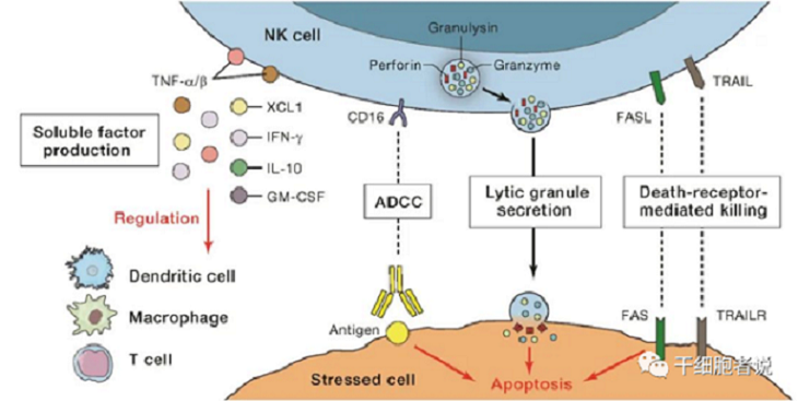 § NK細(xì)胞分泌大量細(xì)胞因子(如IFN-γ、TNF-α、TNF-β、IL-10),生長因子(如GM-CSF)和趨化因子(如CCL3、CCL4、CCL5、XCL1),招募巨噬細(xì)胞、DC細(xì)胞、T細(xì)胞等友軍協(xié)同抗戰(zhàn)。