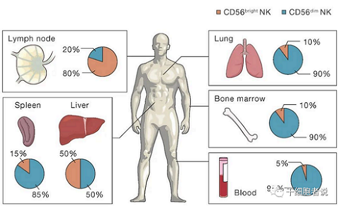 NK細(xì)胞主要存在于淋巴結(jié)、骨髓、外周血、肺、脾臟、肝臟等器官內(nèi);CD56的表達(dá)可以分兩個NK細(xì)胞亞群,CD56dim和CD56bright,其中CD56- NK細(xì)胞具有抗腫瘤細(xì)胞毒性,并且兩個亞群都能夠產(chǎn)生細(xì)胞因子。[圖3]。