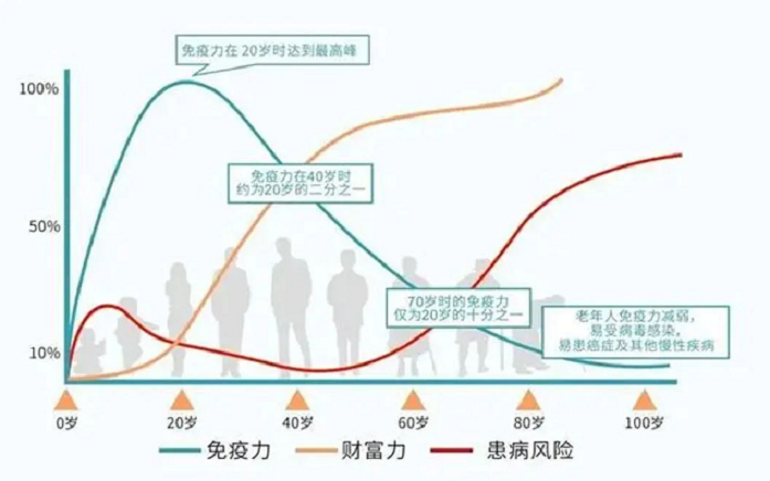 △人體免疫機能從20歲后不斷下降,從40歲開始,患病患癌風(fēng)險概率逐漸增加