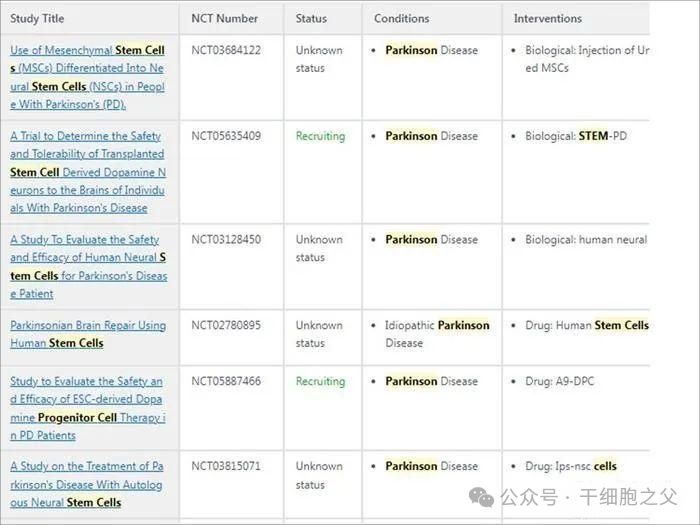 截至目前,在美國國立衛(wèi)生研究院的臨床試驗注冊庫clinicaltrials.gov網站上注冊的有關干細胞治療帕金森病的臨床研究近60項。